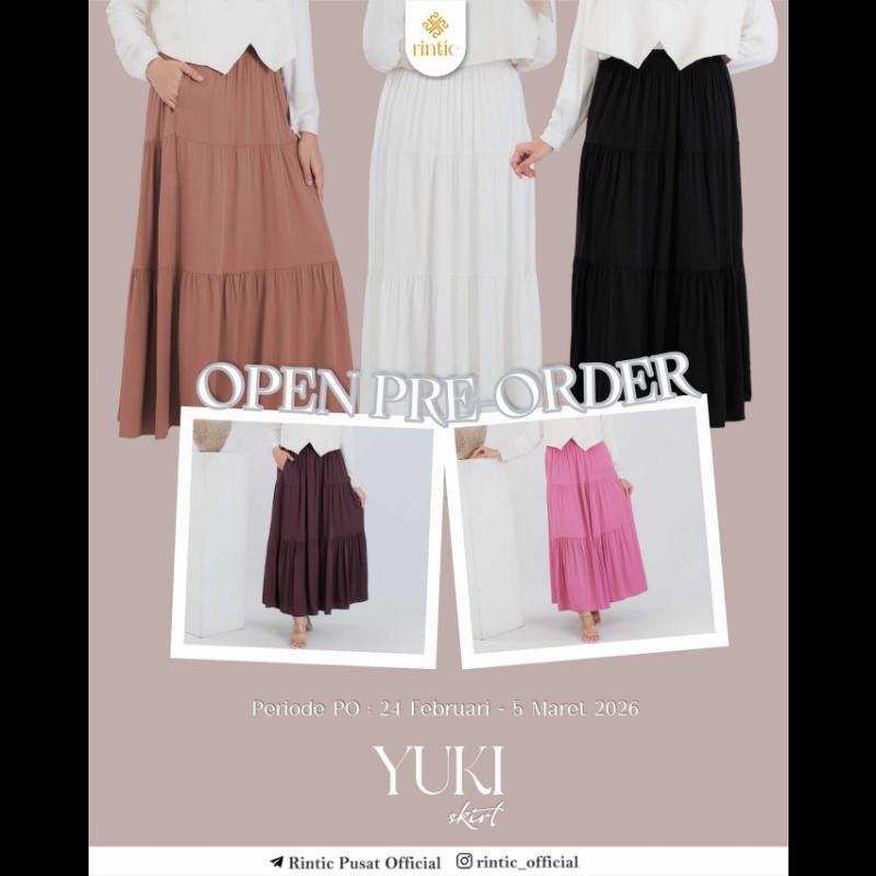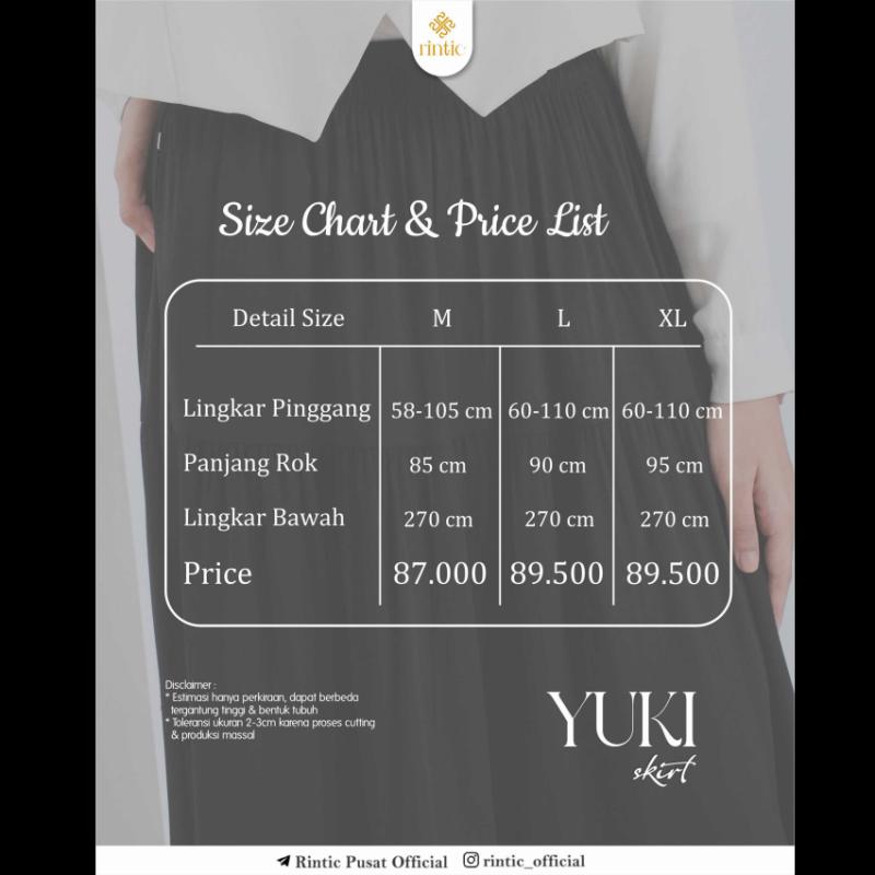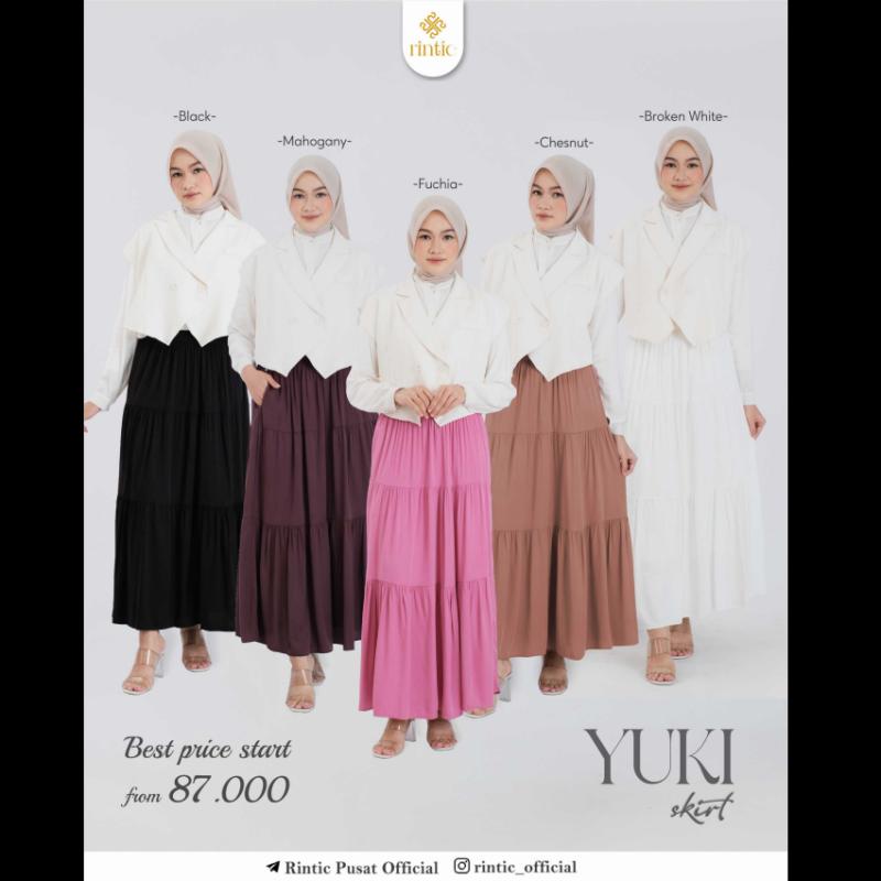 Assalamua'laikum Warahmatullah Wabarakatuh Alhamdulillah Rintic hadirkan produk daily rok, longgar, nyaman dan fleksibel.. YUKI SKIRT ?Spesifikasi?: ? Material menggunakan rayon twill yang halus, adem dan nyaman. ? Menggunakan karet pinggang elastis. ? Model susun dengan cutting lebar dan jatuh. ? Terdapat saku samping kanan. ? Terdapat 5 pilihan warna : ?? Black ?? Mahogany ?? Fuchia ?? Chesnut ?? Broken White Harga super terjangkau, mulai dari 87.000 aja.. Yuk ikutan POnya, jangan sampai ketinggalan ordernya? Disclaimer: ? Terdapat toleransi 1-2 cm karena proses produksi massal ? Noda kapur bukan riject, perbedaan warna 10-20% karena proses pengambilan gambar, editing dan resolusi HP masing masing.
