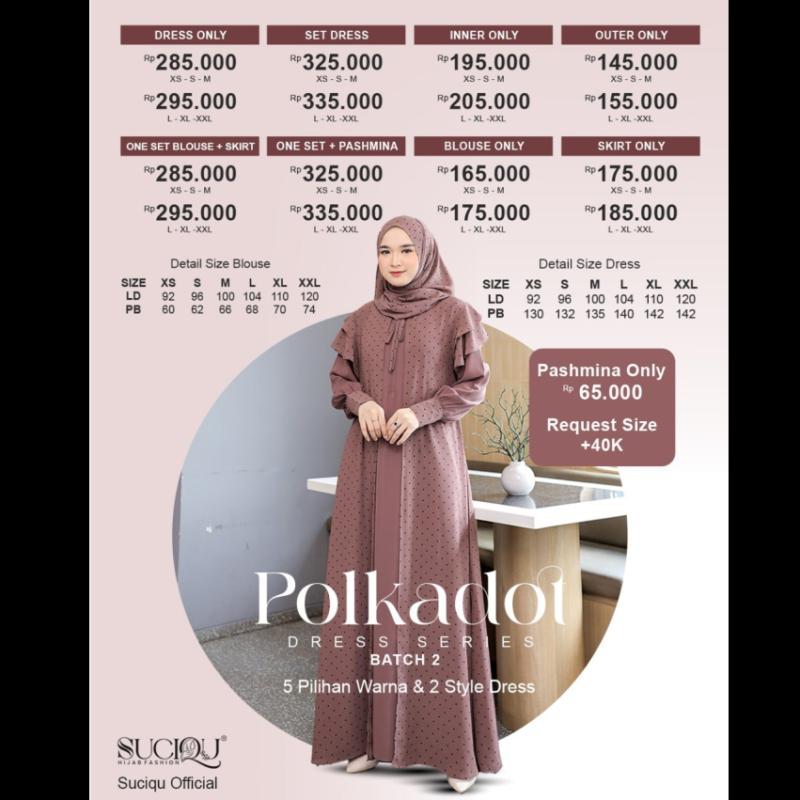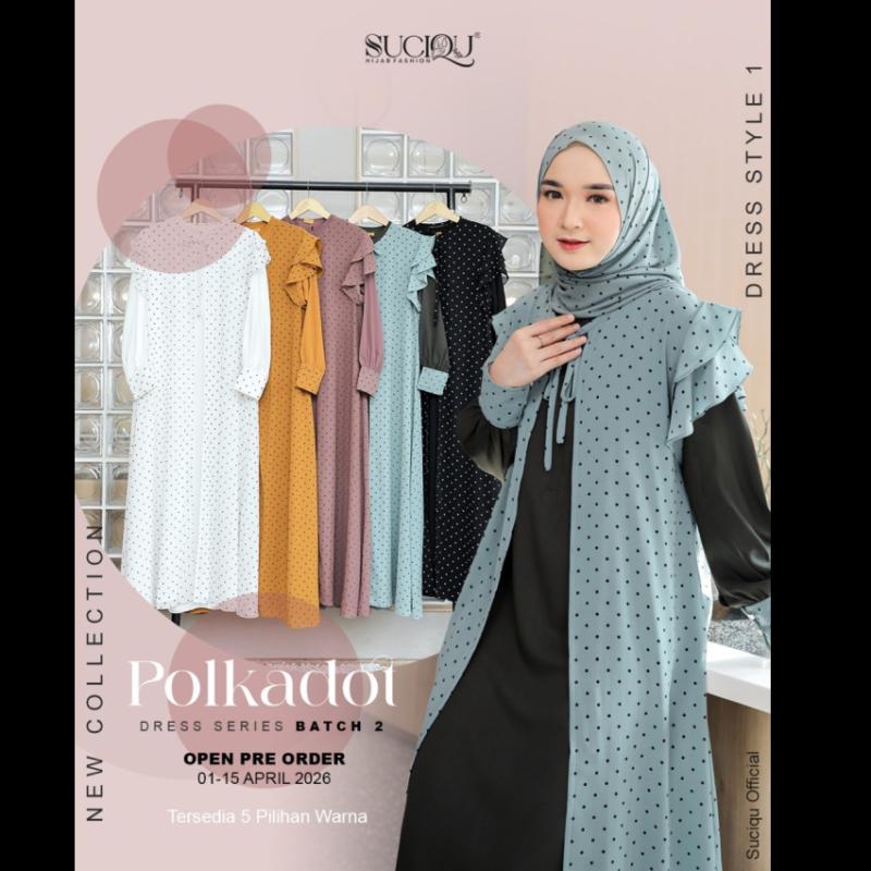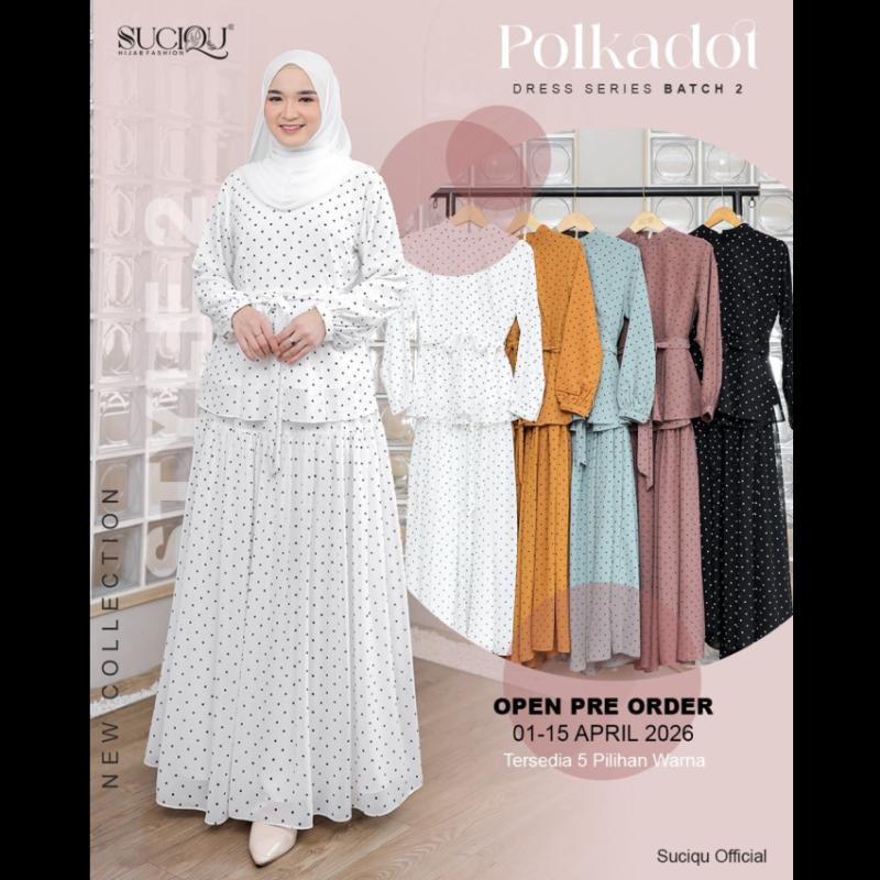 Bismillahirrahmanirrahim.. Open Pre Order Polkadot Batch 2 series by @suciqu.official Periode 01April - 15 April 2026 ??Material : menggunakan kain ceruty printing polkadot dengan karakteristik kain halus, flowly, ringan dan mudah disetrika. Kombinasi kain Morena dengan karakteristik kain yang halus, tebal, adem dan tidak mudah kusut. ? Detail dress : * inner dan outer lepas pasang * Inner kerah bulat ritsleting depan ( busui friendly ) * Kombinasi printing polkadot dibagian manset * Manset 3 kancing hidup (wudhu friendly) * Outer kerah bulat dan terdapat tali yang tersambung dengan kerah leher * Lengan cutting butterfly 2 layer * Kantong dalam bagian kanan ? Detail Blouse : * cutting peplum * Kerah shanghai * Ritsleting belakang * Terdapat tali lepas pasang * Manset kancing hidup (wudhu friendly) * Sudah dilengkapi dengan furing ?Detail skirt : * pinggang full karet elastis * Ruffle meligkar dibagain depan dan belakang * Sudah dilengkapi dengan furing ?Detail pashmina : * menggunakan kain ceruty armany baby doll * All size 73 x 180 ? 5 pilihan warna : * black * Broken white * Mustard * Taupe * Sage green Disclaimer ??toleransi size 2-3 cm karna proses pemotongan saat produksi ??Noda kapur pada saat proses produksi ??perbedaan warna 10-20% karna proses editing dan pencahayaan di HP masing-masing