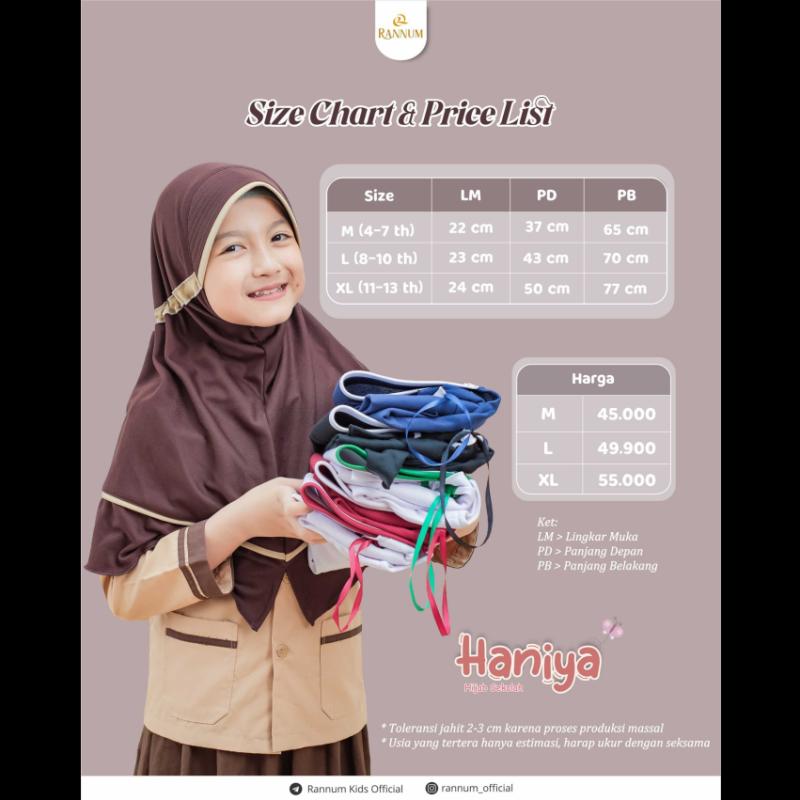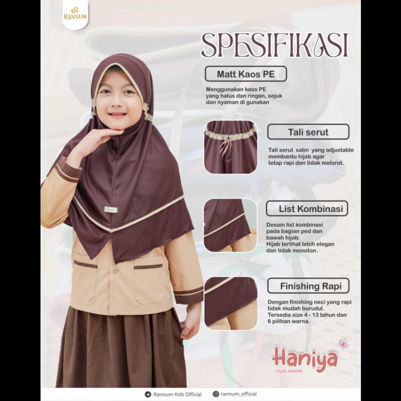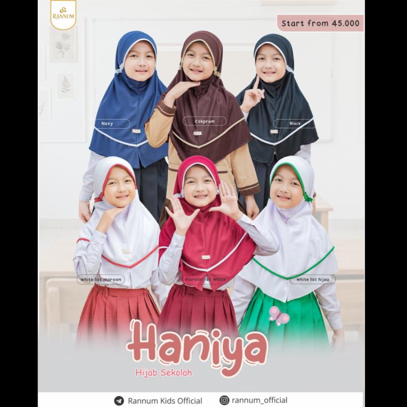 HIJAB SEKOLAH CANTIK, NYAMAN & HARGA SUPER TERJANGKAU Alhamdulillah, telah hadir produk terbaru dengan material yang halus dan adem, InshaAllah nyaman dipakai si kecil beraktivitas?? HANIYA HIJAB ?Deskripsi produk?: ? Material menggunakan kaos PE yang adem, halus & ringan ? Terdapat tali serut satin yang adjustable agar hijab tetap rapi dan tidak melorot ? Desain list kombinasi pada ped dan bawah hijab agar terlihat elegan dan tidak monoton ? Finishing neci rapi tidak mudah burudul ? Tersedia size 4 - 13 tahun dan 6 pilihan warna : ? Navy ? Cokpram ? Black ? White list maroon ? Maroon list white ? White list hijau Harga aman banget moms? Mulai dari 45ribuan aja.. Jangan sampai ketinggalan pre ordernya???? Disclaimer: ? Estimasi usia bukan menjadi patokan, selalu ukur sebelum membeli ? Terdapat toleransi 1-2 cm karena proses produksi massal ? Noda kapur bukan riject, perbedaan warna 10-20 % karena proses pengambilan gambar, editing dan resolusi HP masing masing. #rannumkids #hijabanak #hijabsekolah #hijabcantik #brandanak #hijablucu