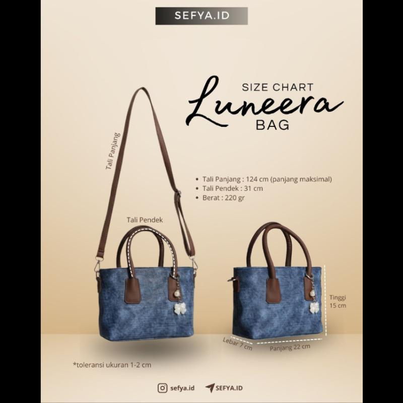NEW COLLECTION BY SEFYA.ID Bismillahirrahmanirrahim LUNEERA BAG Launching now Open Pre Order 10 - 21 April 2026 Koleksi terbaru dari SEFYA.ID tas dengan desain yang timeless. Cocok digunakan untuk berbagai macam outfit dan berbagai acara. COLOURS : 1. Black 2. Dark Denim 3. Soft Denim MATERIAL : PU SOFT JEANS SIZE CHART : 22 x 7 x 15 cm (P x L x T) PANJANG TALI : • Tali Panjang : 124 cm (maksimal) • Tali Pendek : 31 cm BERAT : 220 gr DETAIL : • Terdapat 1 ruang berukuran sedang • Zipper premium • Terdapat handle tas yang kokoh • Tali panjang dapat dilepas pasang • Terdapat gantungan charm yang bisa dilepas pasang • Embos SEFYA.ID dibagian depan SPECIAL PRICE : 115.000 jadi 85.000 (hemat 30.000) ORDER NOW !!! DISCLAIMER • Toleransi size 1-2 cm • Terdapat perbedaan warna antara real dan katalog 5-10% karena efek cahaya, monitor, dll. #luneera #luneerabag #tas #slingbag #handbag #sefya.id