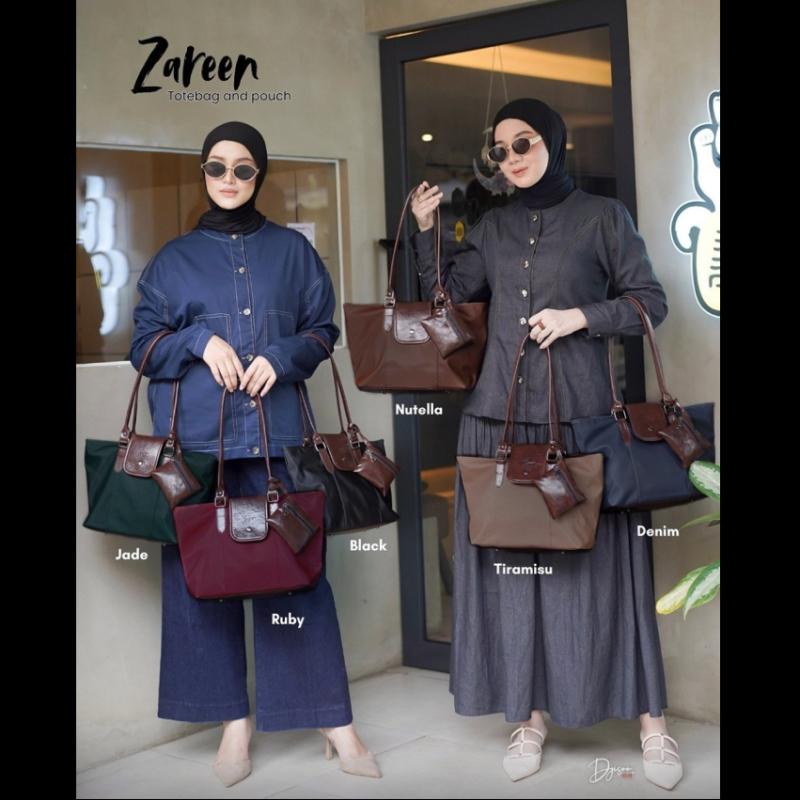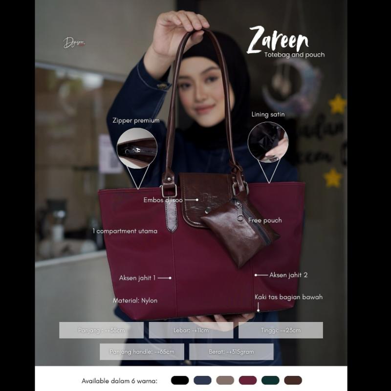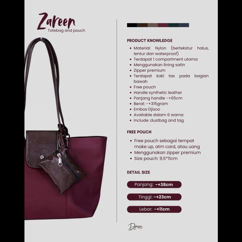ZAREEN TOTEBAG and POUCH PRODUCT KNOWLEDGE; - Material: Nylon (bertekstur halus, lentur dan waterproof) - Terdapat 1 compartment utama - Menggunakan lining satin - Zipper premium - Terdapat aksen 2 jahitan - Handle synthetic leather - ?Panjang handle -+65cm - Berat: -+315gram - Free Pouch - Embos Djisoo - Available dalam 6 warna - Include dustbag and tag DETAIL SIZE; - Panjang: 38cm - Tinggi: 23cm - Lebar: 11cm DETAIL POUCH; - Free pouch sebagai tempat uang, make up, atau atm card - Menggunakan zipper premium - Size pouch: 9,5*11cm Note: Perbedaan warna 10-20% karena adanya proses editing dan cahaya masing masing device #zareenbydjisoo